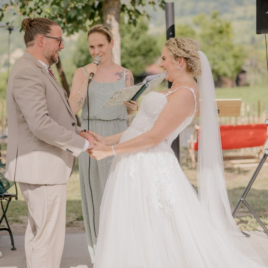 "Ein Herzensmensch durch und durch – danke, liebe Melissa! Melissa war für uns einfach die perfekte Traurednerin. Schon in der Vorbereitung war sie unglaublich aufmerksam, herzlich und professionell – sie hatte immer ein offenes Ohr, tolle Ideen und hat uns in jeder Phase das Gefühl gegeben: Wir sind in den besten Händen. Die Zeremonie selbst war genauso, wie wir es uns gewünscht – und vielleicht sogar noch ein bisschen schöner: persönlich, emotional, mit ganz viel Gefühl, feinem Humor und einfach so, wie wir sind. Melissa hat es geschafft, unsere Geschichte in Worte zu fassen, die uns mitten ins Herz getroffen haben. Als Kollegin wusste ich natürlich, dass sie ihren Job liebt – aber sie bei unserer eigenen Hochzeit zu erleben, war nochmal etwas ganz anderes. Es war einfach rundum stimmig, liebevoll vorbereitet und mit so viel Gespür für die kleinen, besonderen Momente. Danke, Melissa – für deine Zeit, deine Worte, deine Wärme. Wir hätten uns niemand besseren an unserer Seite wünschen können. 💛"